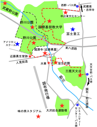 ◆野川公園: ICUの南門を出て東八道路の北側の歩道を400mほど行くと「野川公園」入口。 この400mは「交通取締」のメッカ。スピード違反と車線変更に気を付けよう。 まず、野川公園の北側エリア。中央を野川が流れ、水遊びが出来る。50mくらい先の東八道路を跨ぐ陸橋で南側に行ける。 野川公園は25年前くらいまではICUのゴルフコースだったので芝生が多い。また、その前も原野を拓いて作ったコースだったので、樹木もまさに年輪を感じさせる風格のある木ばかり。 ◆◆◆◆ 近藤勇ゆかりの地 ◆◆◆◆
