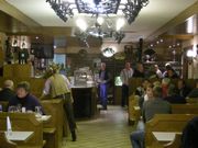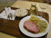 通常は裏庭に木のテーブルとベンチを出して飲ませるスタイルだが、こう寒くては庭で飲むのはつらく、開けている店は少ない。中には大きな部屋を用意して冬でも飲ませるホイリゲもあって、我々はレントナーLENTNERと言うホイリゲに入った。席に座るとワイン係りのおばあちゃん(不思議なことに、どこもおばあちゃんの役目らしい)が注文を取りに来る。白ワインの新酒を1/2リットル頼む。料理はショーウィンドウから好きなものを指差して貰い、そこで金を払う。私たちは ローストポーク、ハッシュポテト、ザワークラウト、白アスパラのサラダを貰う。新酒はフルーティーでおいしい(我々はワイン音痴だから高級なすっぱいワインのおいしさが分からない)。料理も家庭料理系でおいしい。 ※ ホイリゲ:オーストリーには、ワイン農家は自家製ワインを年間300日を限度に客に直接飲ませても良い・・という法律があり、この酒場をホイリゲと言う。ホイリゲとは本来"新酒"と言う意味だが、今は新酒以外にビールなども提供する。この季節、日本と同じく入口には「新酒あり」の杉玉がぶら下がっている。 ※ なお、イタリアのトリエステ周辺からスロベニアの沿岸カルスト地方にもホイリゲと同じようなものがある。 OsmizzaまたはOsmicaで検索すると多数出てくる。 >>ホイリゲのホームページ