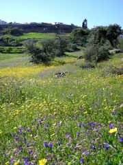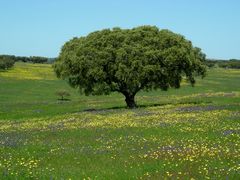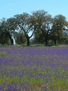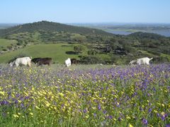 エボラからN256を西へ60km、スペイン国境に近い標高約330mの「鷹ノ巣村」モンサラーシュ村を目指す。途中の田舎道は交通量も少なく、両側にはコルク樫が点在する牧草地が広がる。道端と牧草地には花が咲き乱れ、まるでお花畑をドライブしているよう。春爛漫である。