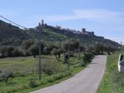 モンサラーシュへの分岐案内(名所は茶色の道標)が見え山道を駆け上ると、頂上がモンサラーシュ。城壁の中は狭い道が入り組み自動車には不向き。城外の駐車場に自動車を停め、荷物をぶら下げて宿まで歩く。