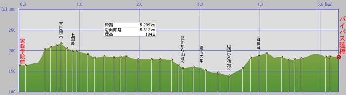 特に高低差のある16号バイパス陸橋から御殿峠、七国峠、家政学院までの高度図