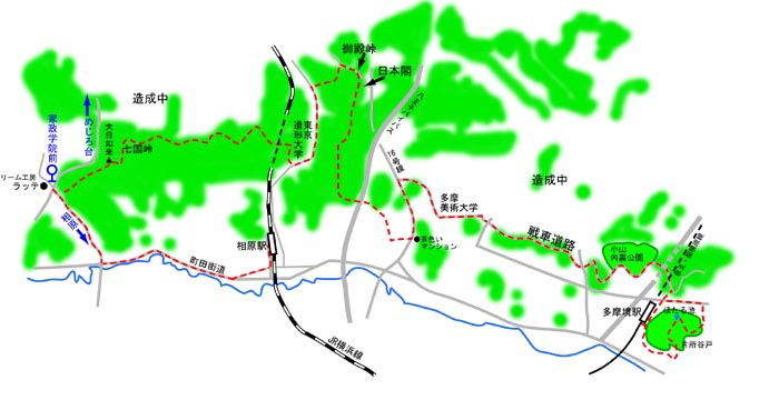 民家の庭のユリ 八王子バイパスを横切る。高層ビル群は橋本駅。 御殿峠への道。この道の左側に古代鎌倉道が平行して走っている。 造形大学正門。豪華な校舎、そして駐車場には学生のバイクがいっぱい。芸術家のたまごは貧しくなくてはいけないのに・・・