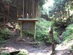 ダムが出来る前からあったと思われる「今刀比羅宮」に手を合わせてから発電所を迂回してスポーツ広場へ。スポーツ広場にはトイレや清涼飲料の自販機がある。風が良く抜ける藤棚の下のベンチで昼食。あまりの暑さに年甲斐もなくファンタを一気飲み。 Bから南東に伸びる尾根道に入る。 評議原には見事なもみじがあり、秋はすばらしいそうだ。その先から檜の美林が続く。 この辺には猪が掘った穴が沢山ある。途中「小松城跡」があり、今でも空堀の跡が幾つか残っている。