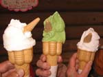 | トンネルを抜け、家政学院の交差点へ。ここにはアイスクリーム工房「ラッテ」がある。冷たいアイスクリームは猛暑を歩いて乾いたノドにしみこむ。でも、まだ渇きが止まらないので、牛乳も飲む。濃厚でおいしい。他に飲むヨーグルト、烏骨鶏の卵なども販売。 ここから、相原行きのバスに乗り帰路につく。 ←左から「フレッシュミルク」「抹茶」「巨峰」 |