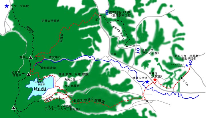高尾駅南口のバスターミナルから館町団地行きのバスで15分。200m先の町田街道の交差点が「館町清掃工場入口」。この交差点から50mほど南に行くと右側に駐車場。 この駐車場の奥に上り口がある。 |